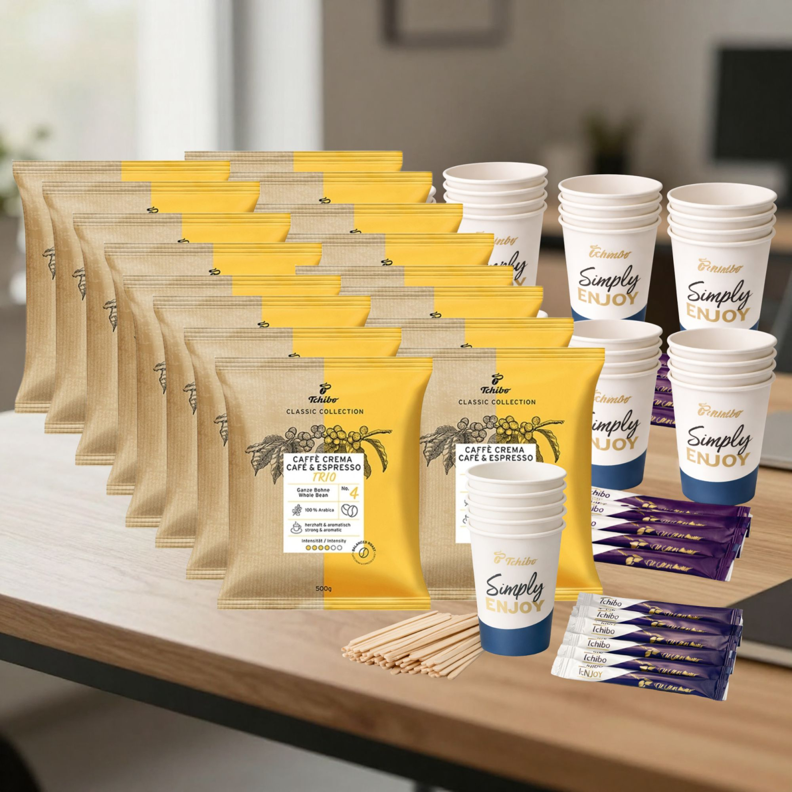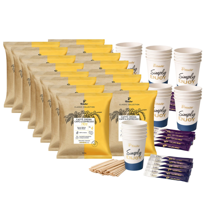 Include 8 kg cafea boabe Tchibo Trio și consumabile complete pentru servire profesională: pahare To Go, zahăr stick și paletine.