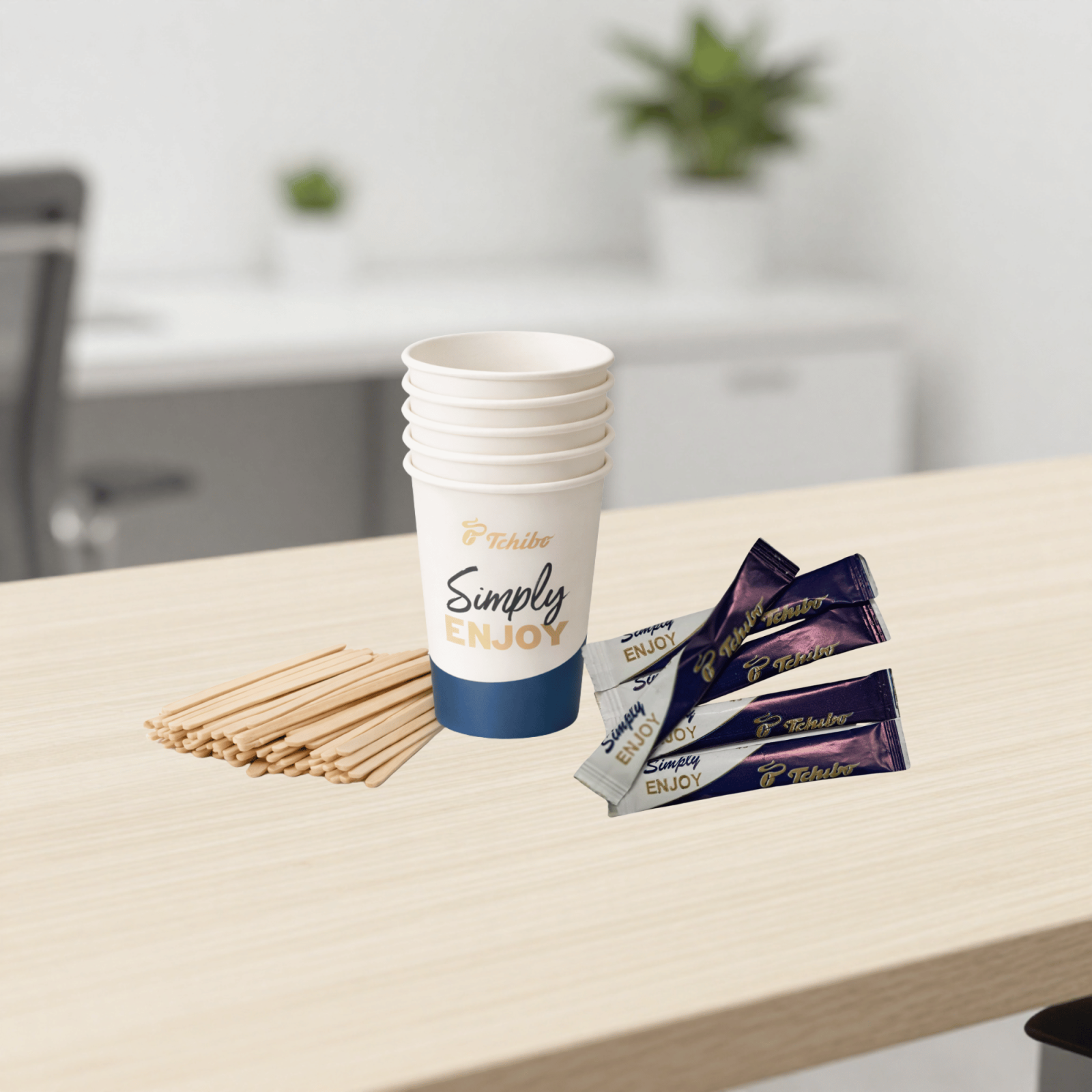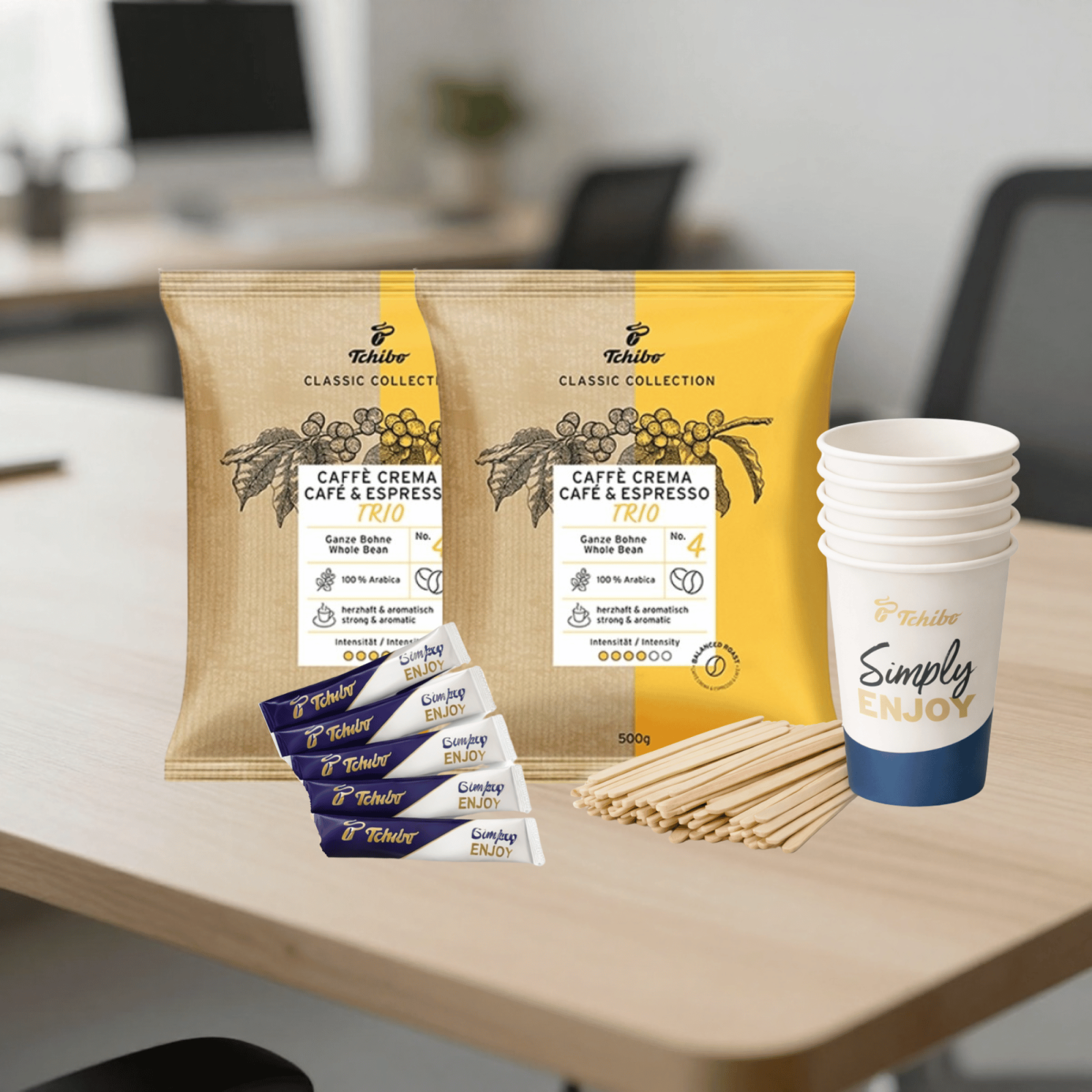 Conține 1 kg cafea boabe Tchibo Trio (2 x 500g), pahare To Go, zahăr stick și paletine – tot ce ai nevoie pentru servirea profesională a cafelei în birou, salon, cabinet sau spațiu comercial.